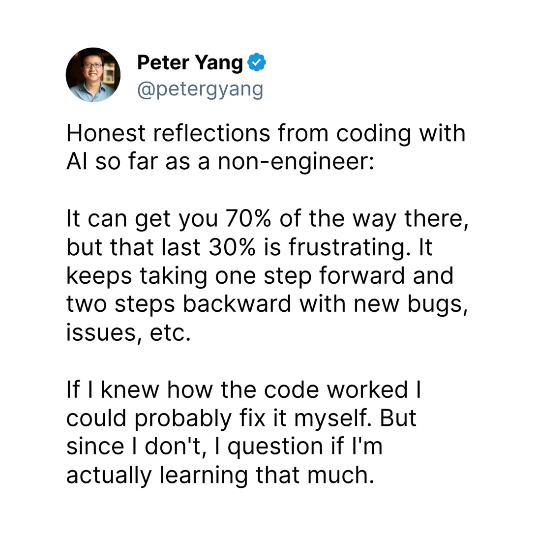 它能帮你完成70%的工作,但最后30%令人非常沮丧。每前进一步,就会因为新的bug和问题而后退两步。如果我知道代码是如何运作的,也许我自己就能修复这些问题。但由于我不懂,我开始怀疑自己是否真的学到了什么。”