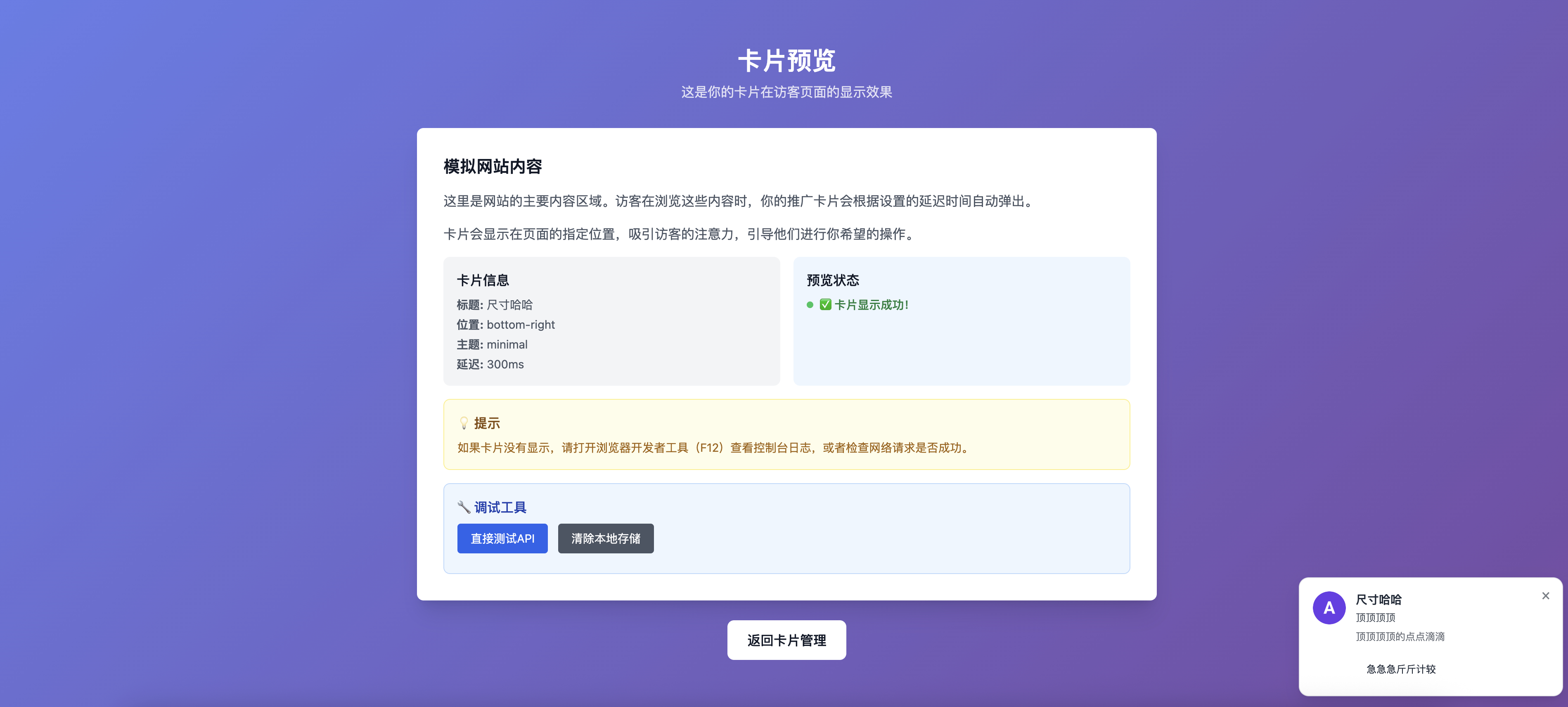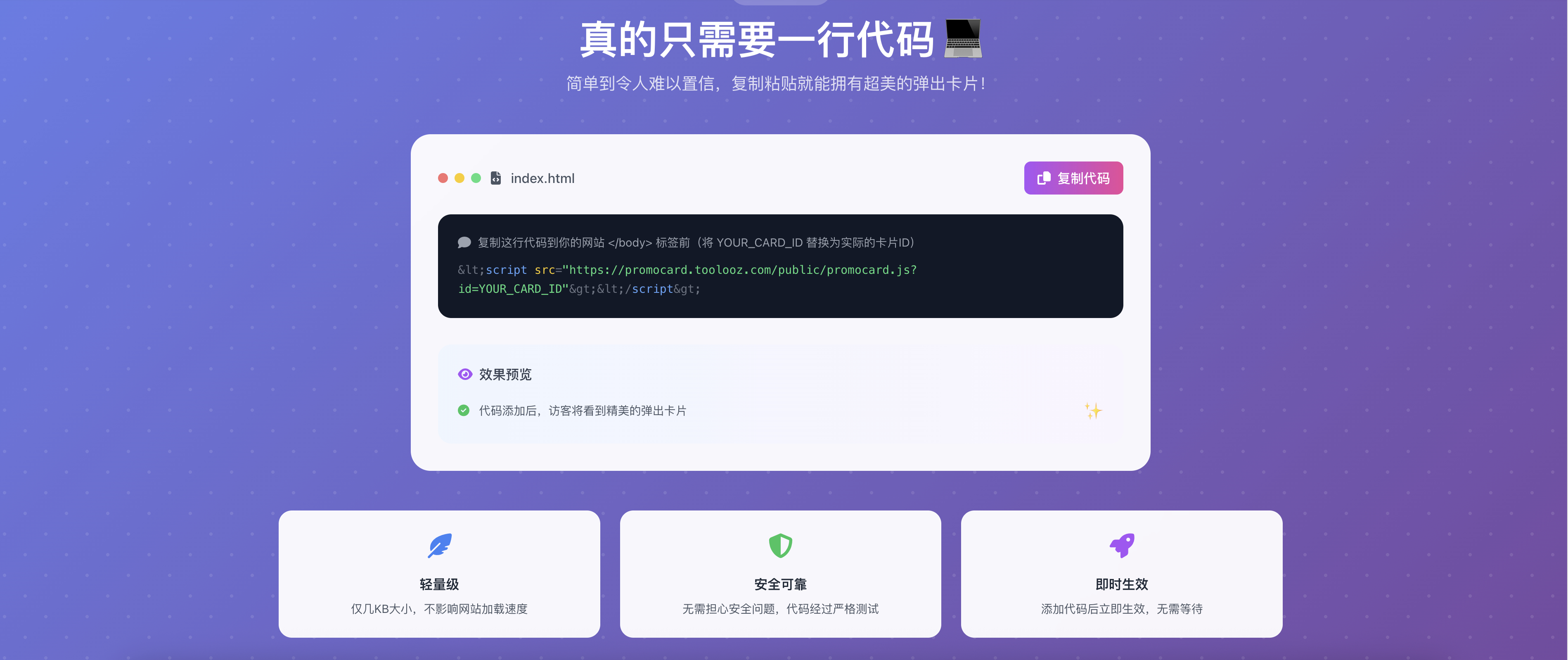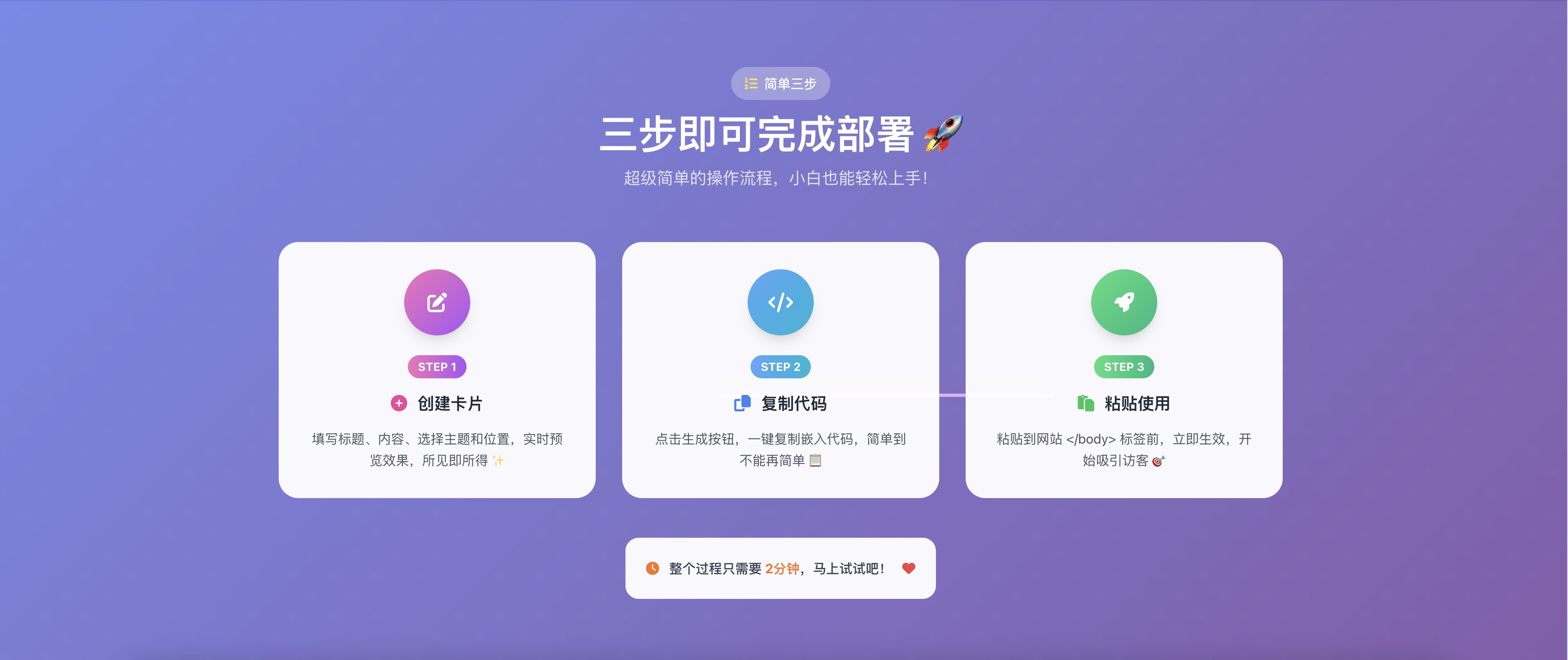 三步即可完成部署: 创建卡片、 复制代码、 粘贴使用,整个过程只需要 2分钟,就可以实现产品或网站的精美弹出卡片效果,让每一个访客都可以看到。