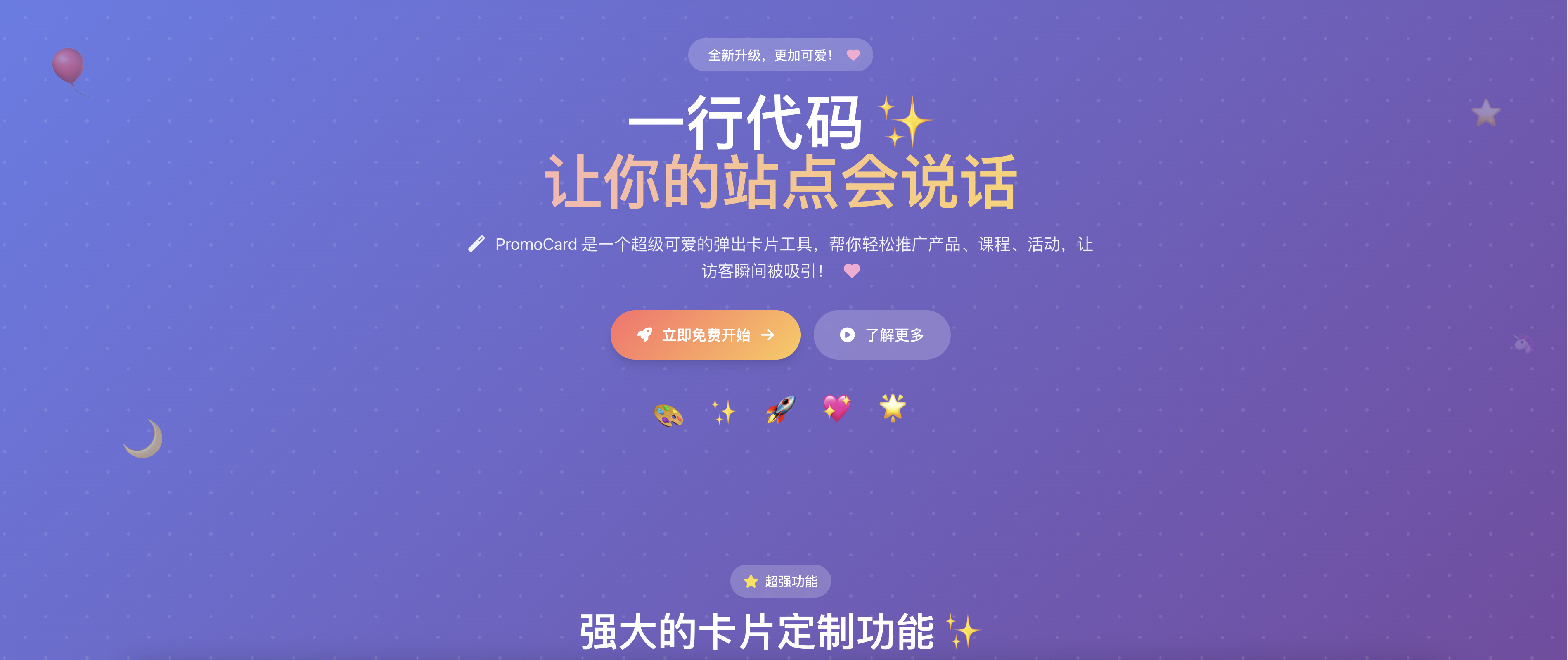 PromoCard是一个弹出式卡片定制工具,可以帮助开发者、站长轻松推广产品、课程、活动,让访客瞬间被吸引。