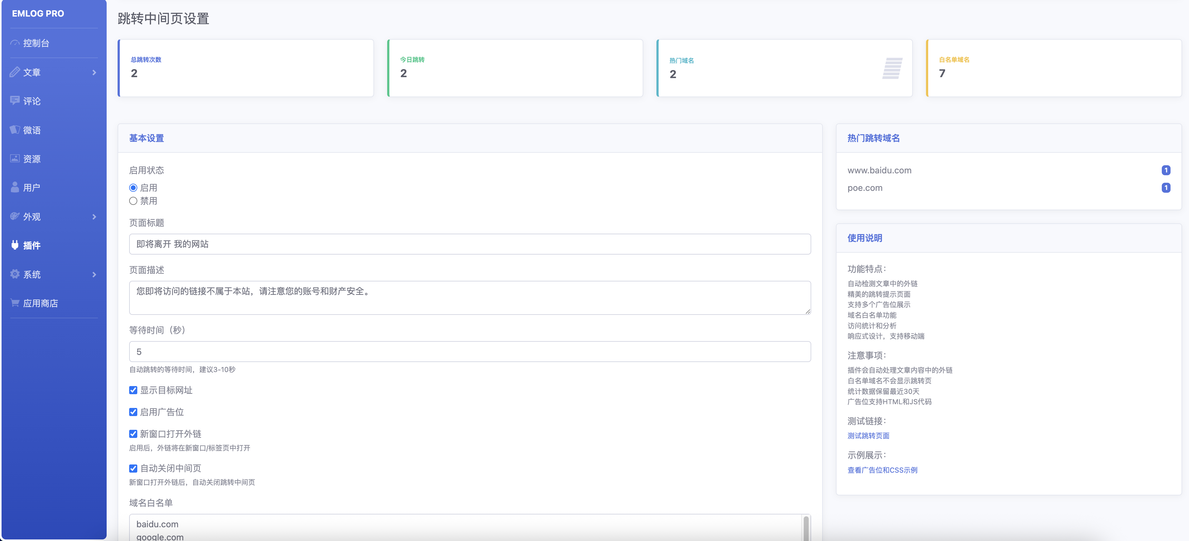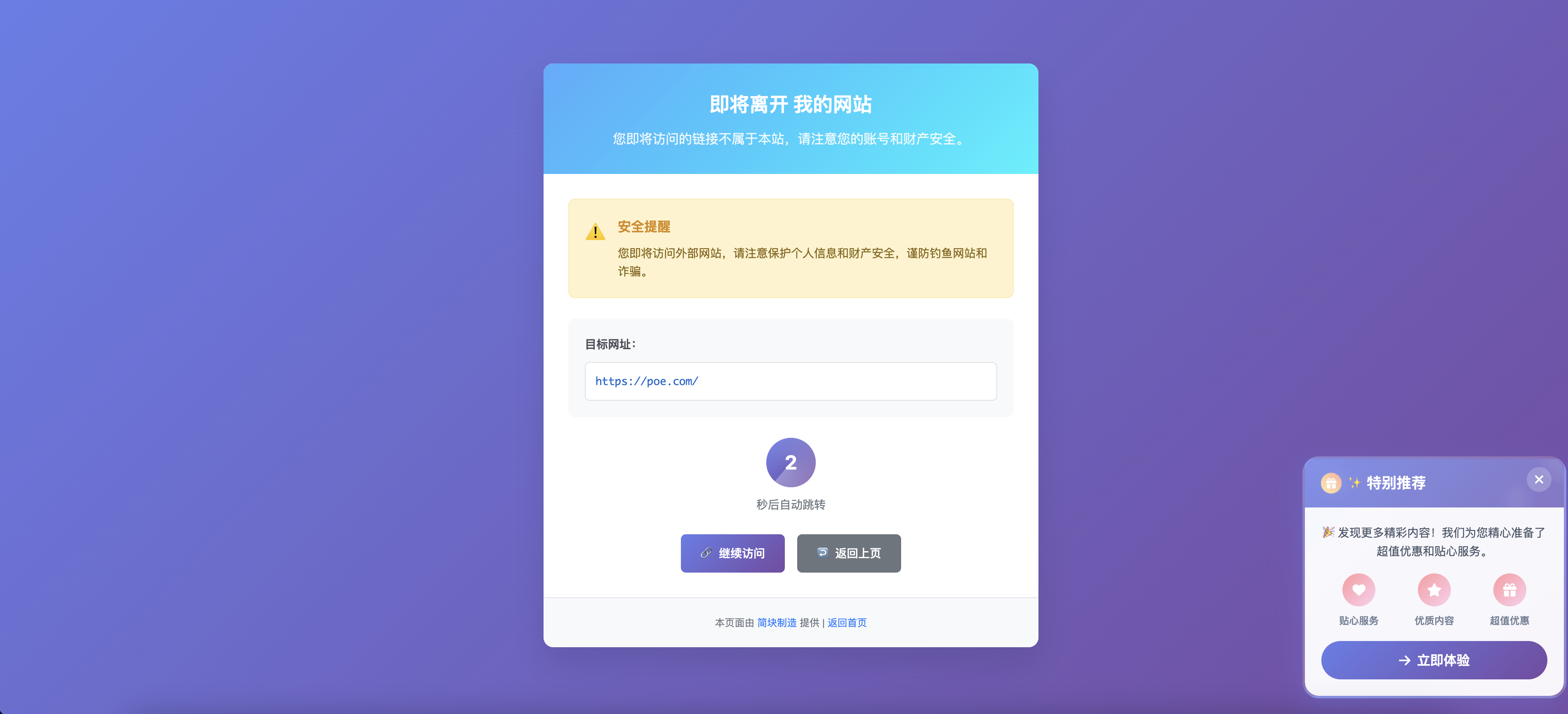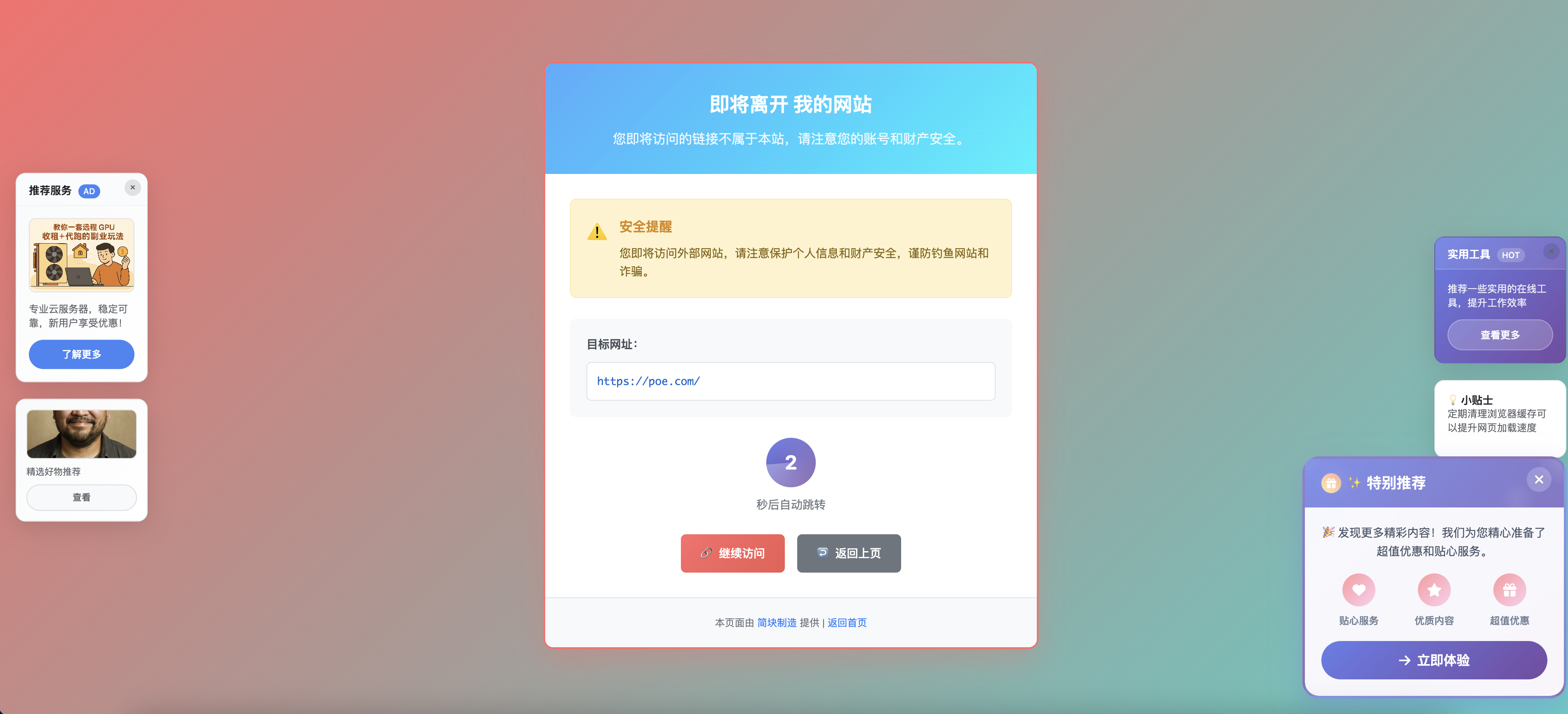 插件叫「跳转中间页」,主要是用来处理文章里的外部链接。它会自动检测外链,点的时候先跳转到一个提示页面。这个页面可以做访问统计、加广告,也支持自定义样式。