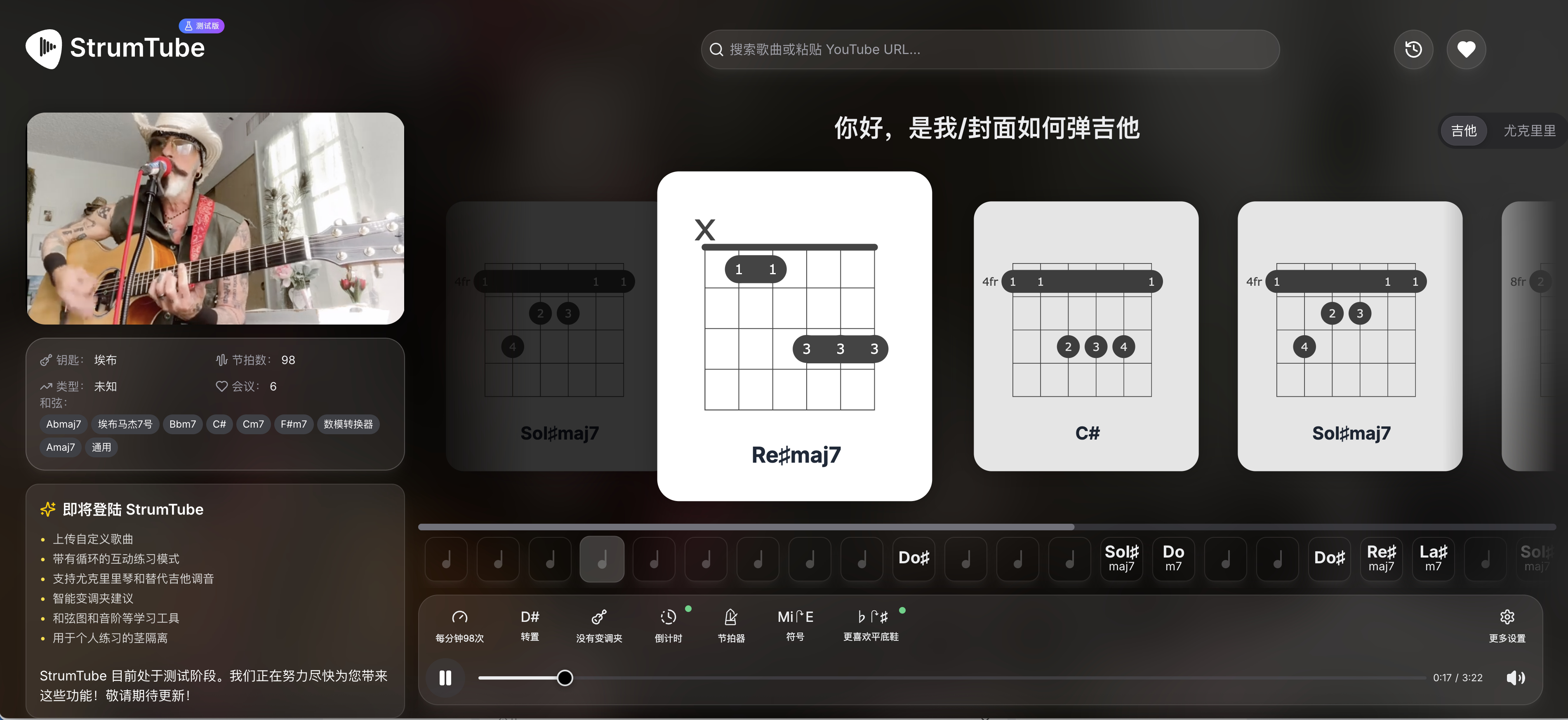 贴个油管歌曲链接,它能瞬间生成超准和弦,支持吉他/尤克里里。自动识别和弦 + 智能变调夹建议,支持变速、节拍器、循环练习