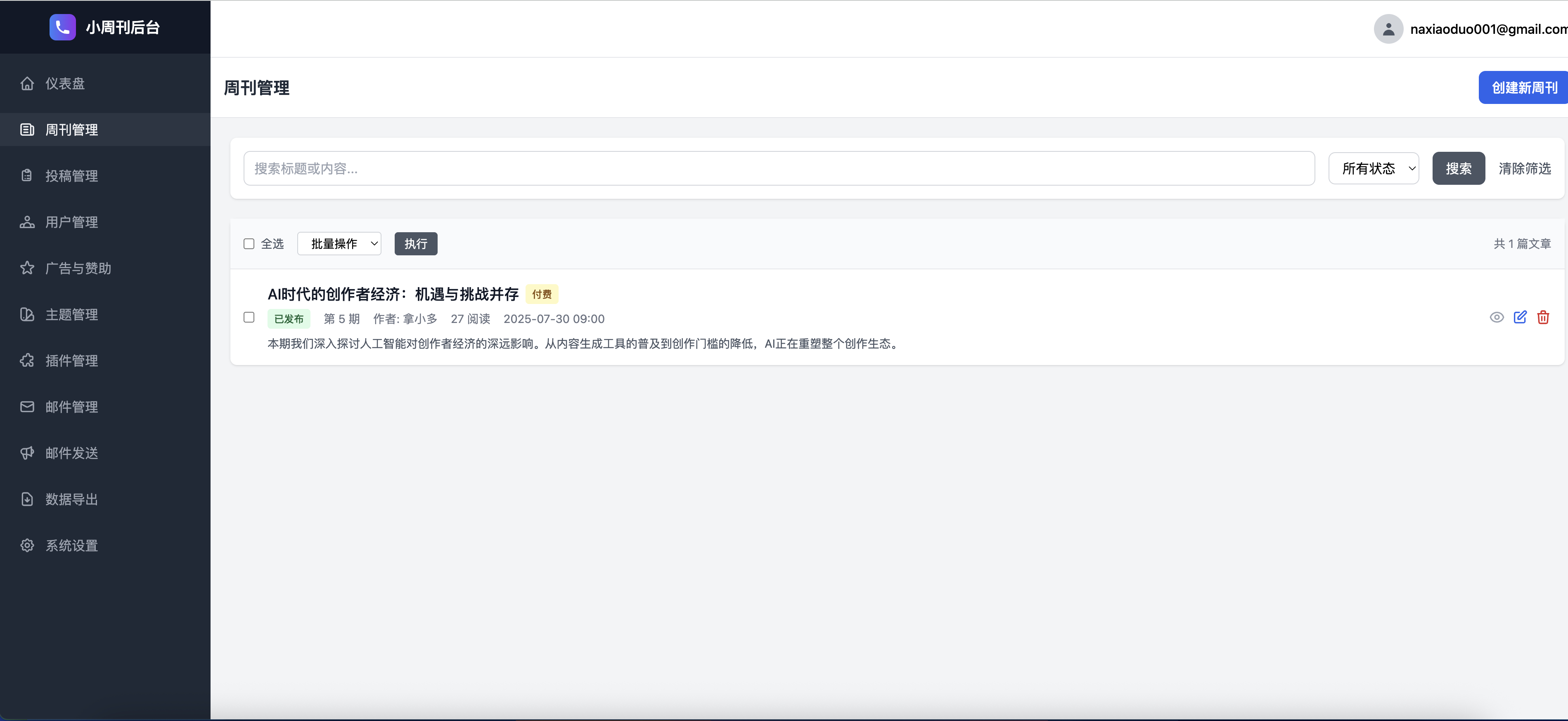新增激活码管理插件,通过激活码管理付费会员,支持多种会员类型...拿小多8/6/2025新增激活码管理插件,通过激活码管理付费会员,支持多种会员类型和批量生成激活码,这样方便在淘宝等出售激活码来激活月费、季费、年费或终身会员。这样做是为了降低门槛,因为支付宝、微信支付,基本上只有企业才能申请支付接口。当然,后面也可以再搞个支付插件来解决直接支付的问题。 查看图片 - 转发 @拿小多: 开发一套小周刊系统,支持SMTP 邮件推送周刊,免费+付费订阅,广告赞助。支持插件扩展和主题模版、API接口,专为周刊而设计的系统。 返回首页查看原文