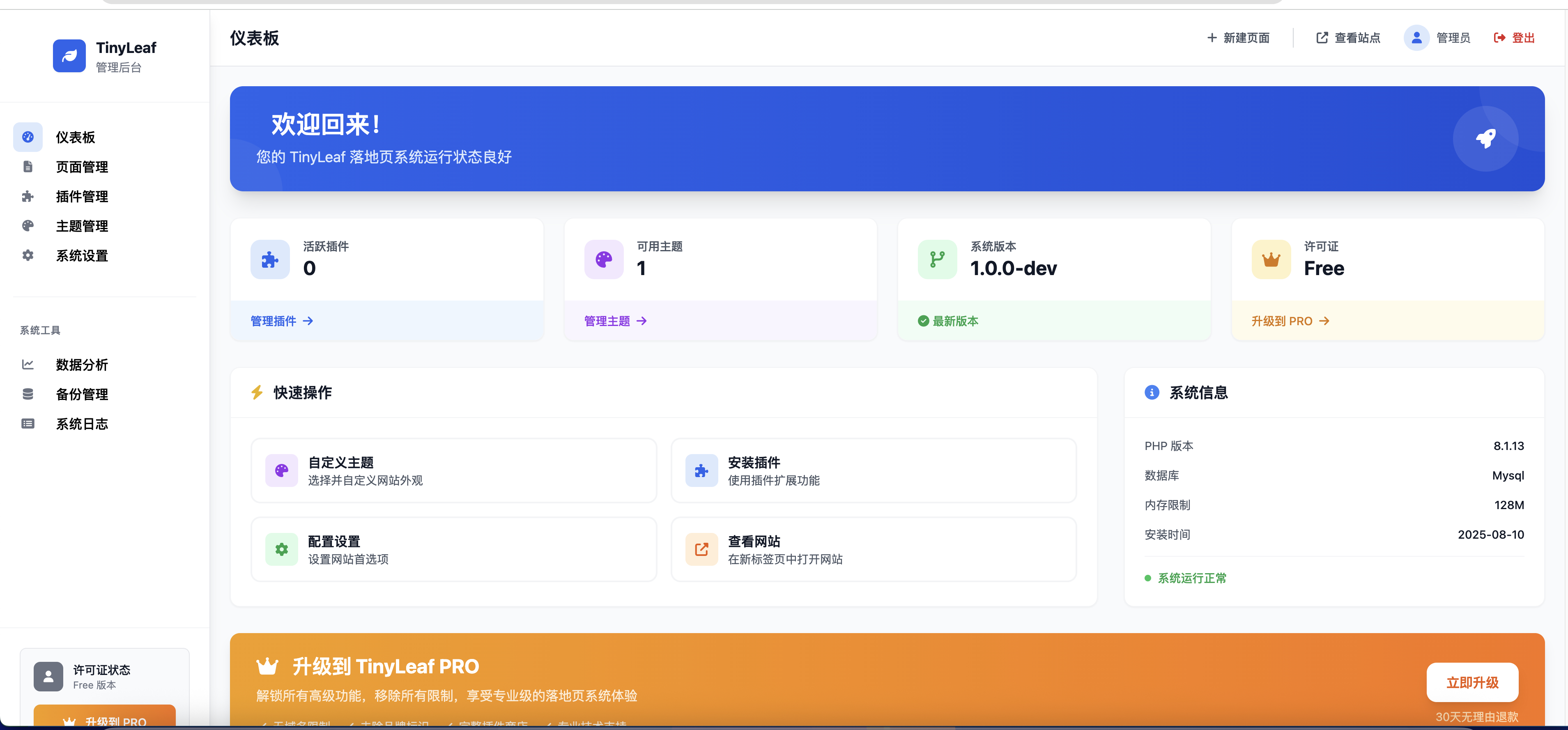 - 转发 @拿小多: TinyLeaf:一款可扩展的落地页系统,先搭建好了基础架构(就像盖楼一样),地基打好了,后面逐步完善。支持主题模版、插件市场,提供免费开源基础版,PRO专业版可以解锁主题模版、插件商店,并享受优先支持权益。