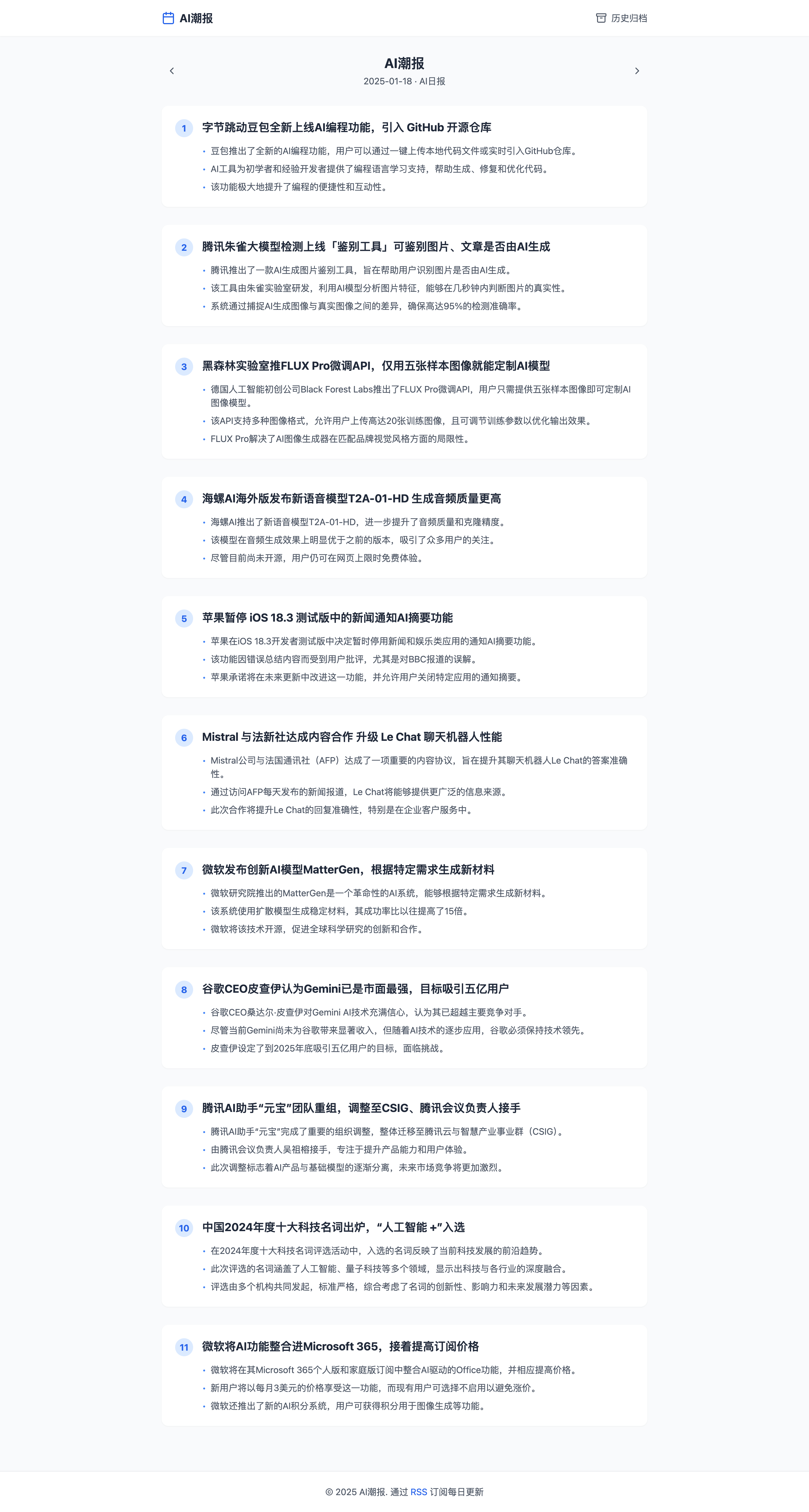 回家了,也闲不住,想着做几个新产品,先做一个 AI简报 - ...拿小多1/18/2025回家了,也闲不住,想着做几个新产品,先做一个 AI简报 - 每日AI要闻速递。每日自动抓取AI新闻资讯,汇总成AI简报,自动发布,踩准AI浪潮,不错过每个机遇。 返回首页查看原文