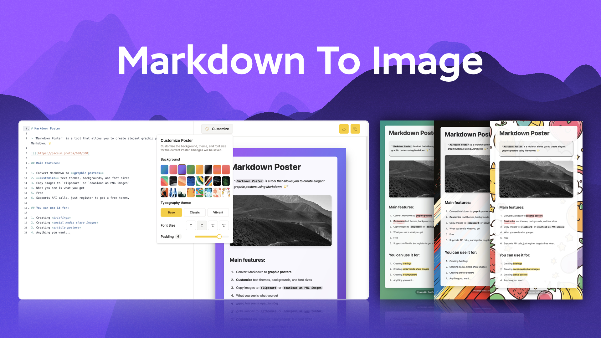 - 转发 @GitHubDaily: GitHub 上一款将 Markdown 转换为漂亮的图片工具:Markdown To Poster。