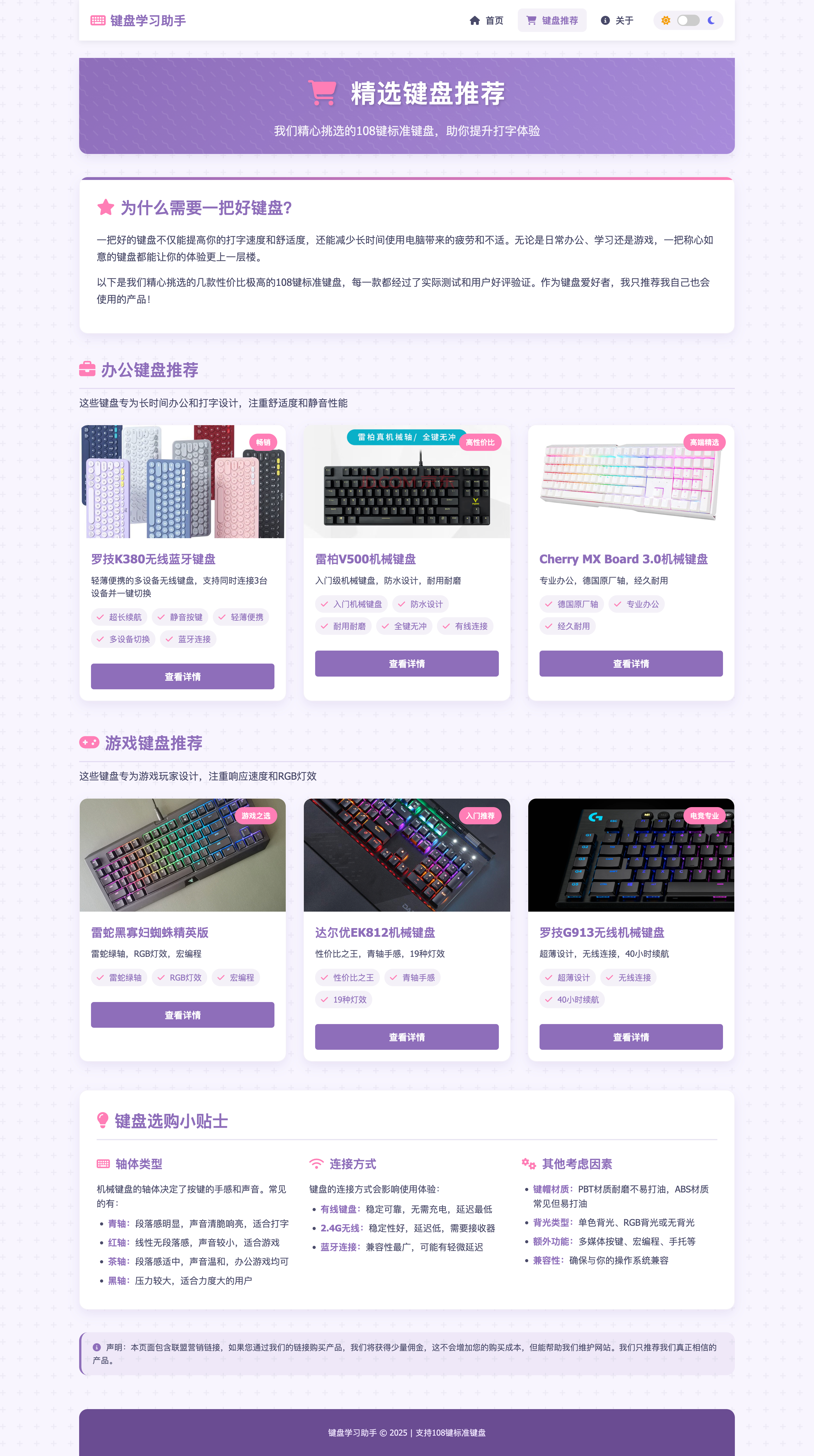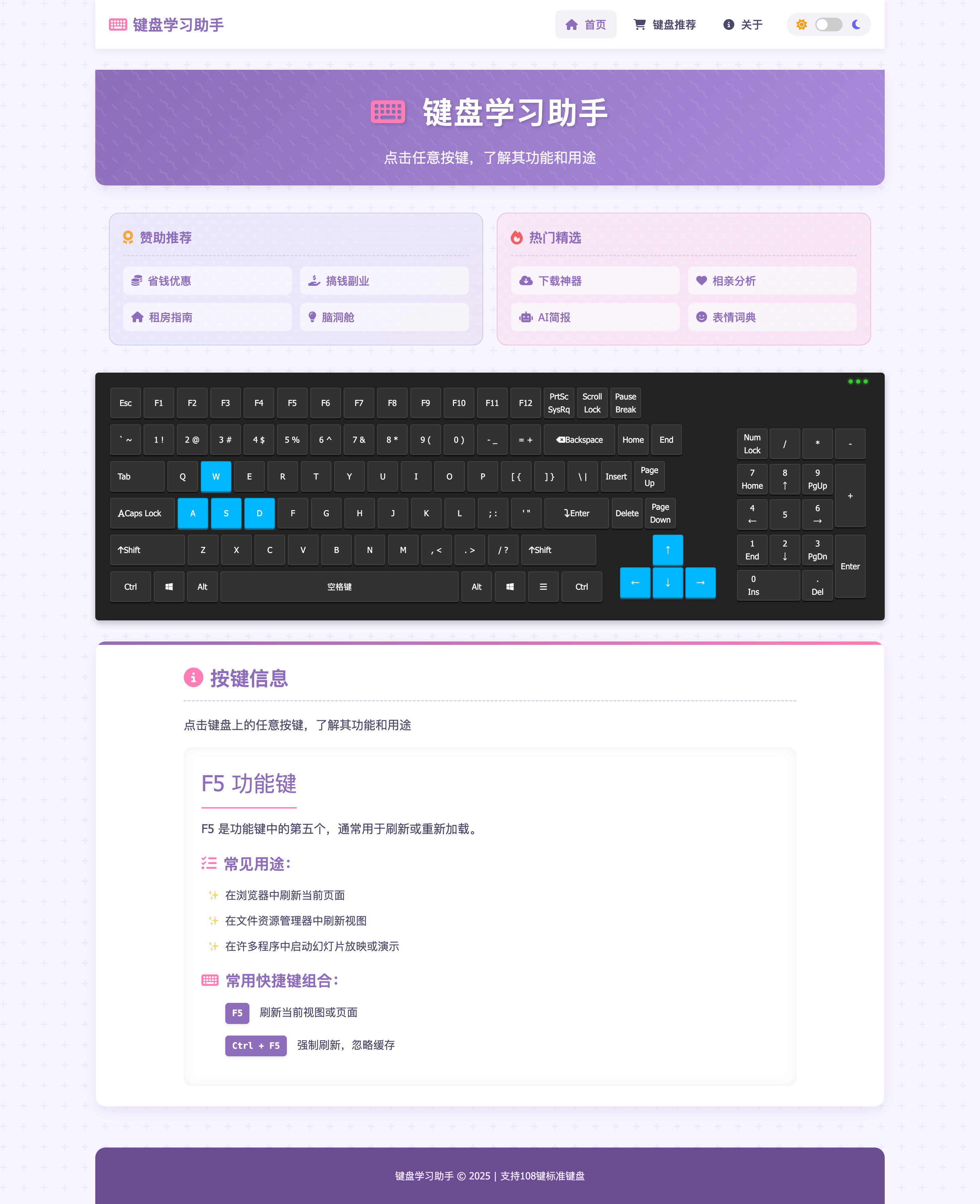 于是我做了这个小网站 - 一个交互式的108键标准键盘学习工具。你可以点击任意按键,立刻看到它的功能介绍、常见用途和快捷键组合。比如点击F5,不仅告诉你它是"刷新",还会详细解释在不同场景下的用途。