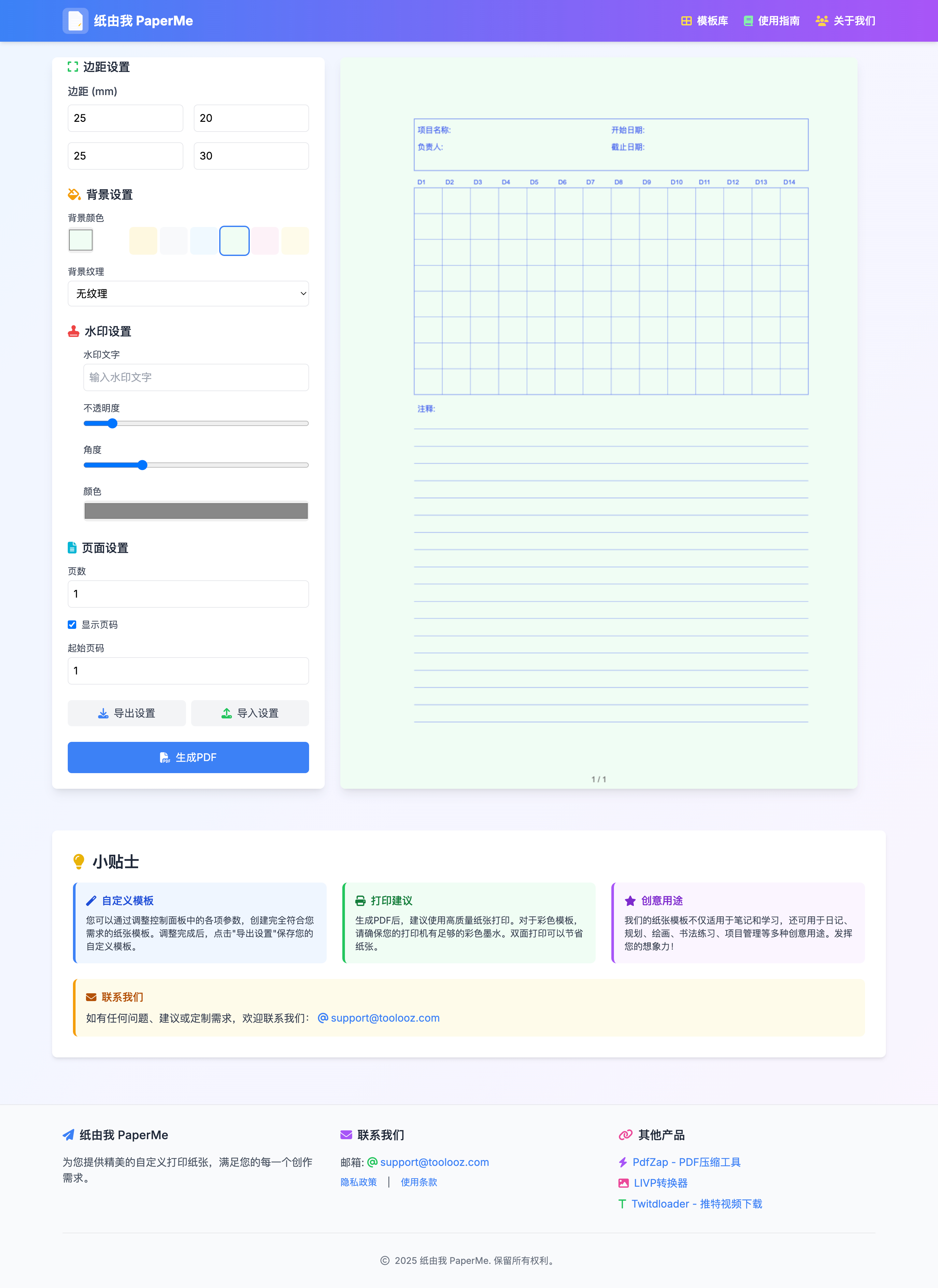 它的特色在于完全自定义。纸张尺寸可以选A4、A5,甚至自己输入想要的大小。调参数的时候,网页上能实时预览,你动一下鼠标,效果立马就出来,特别直观。