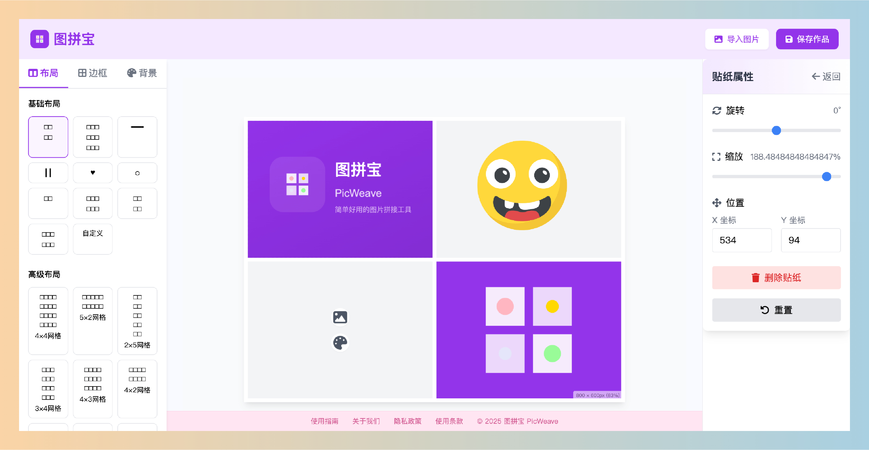 图拼宝其实很简单,就是个在线图片拼接工具。你可以用它拼照片墙,发社交媒体,或者随便把几张图凑一块儿。它有不少布局模板,能调图片位置、大小,还能加点文字和贴纸装饰。