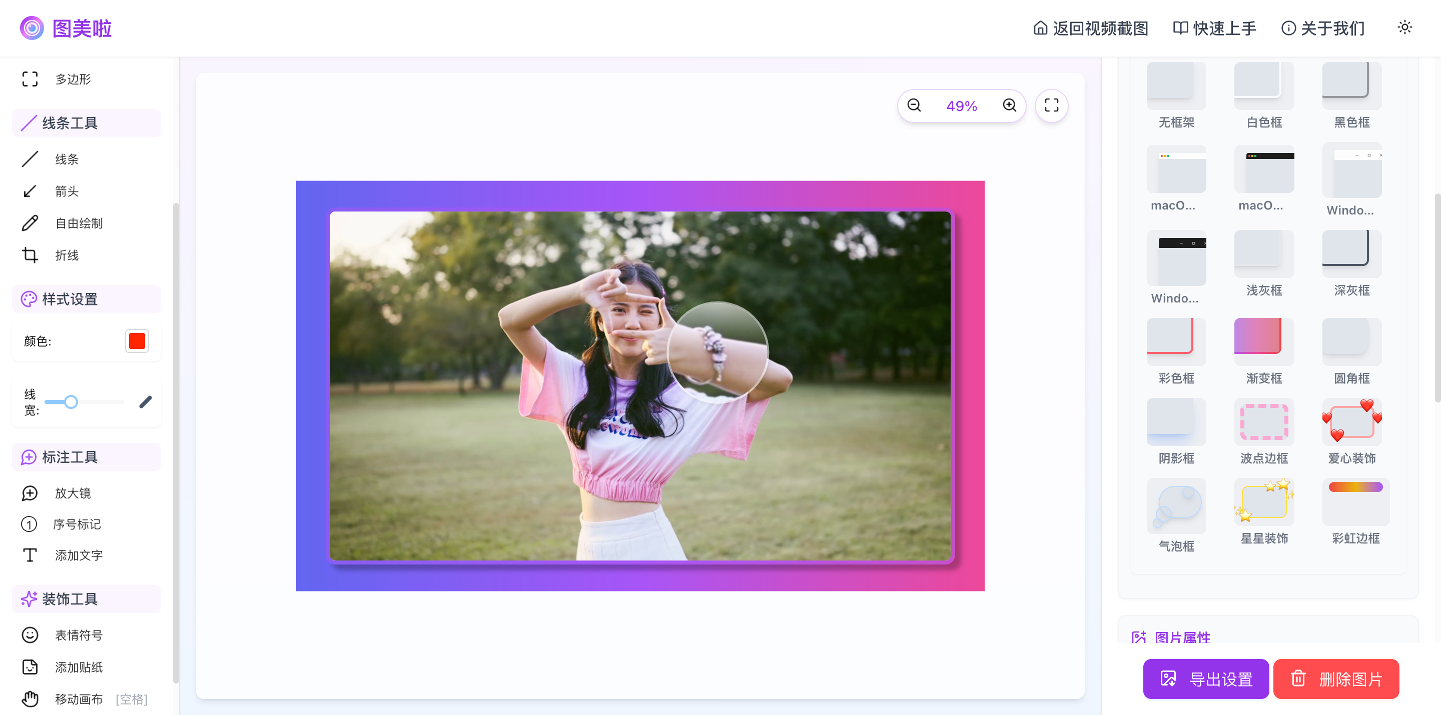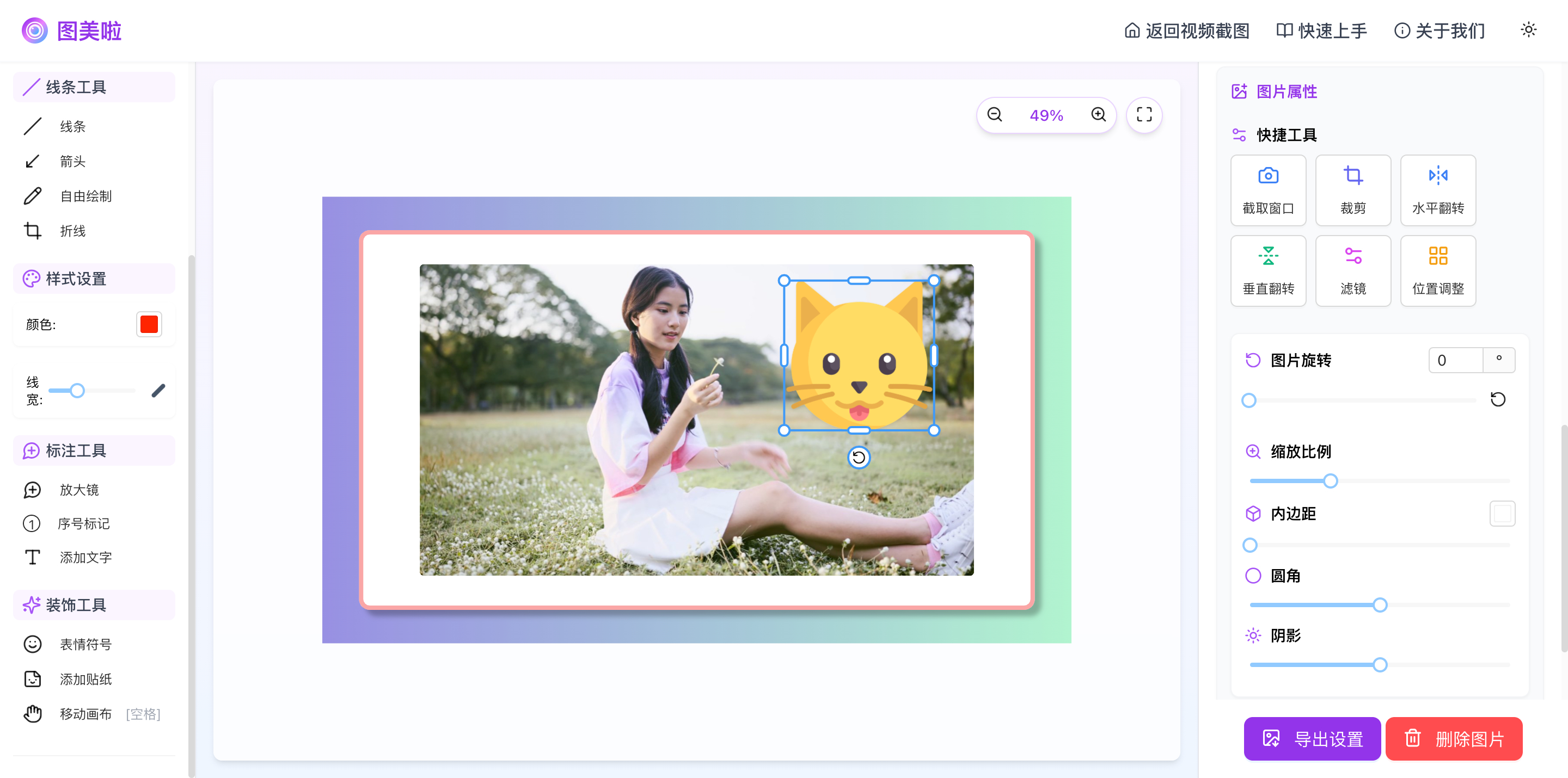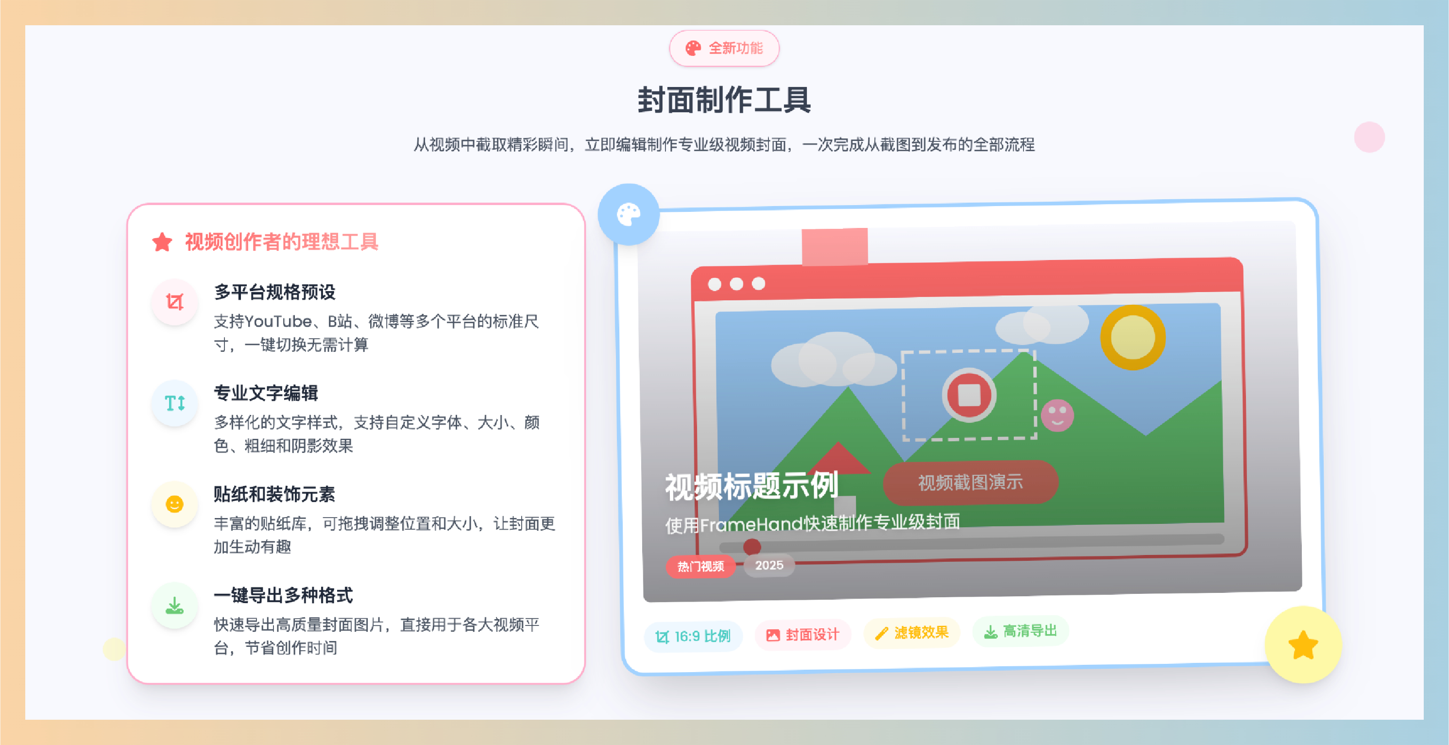 现在,使用图美啦——从上传视频→批量截图→编辑截图(支持裁剪、预设尺寸、美化、标注、文字、贴纸...背景美化...等等)→返回视频截图→编辑新的封面图,现在都可以一站式制作视频封面图。