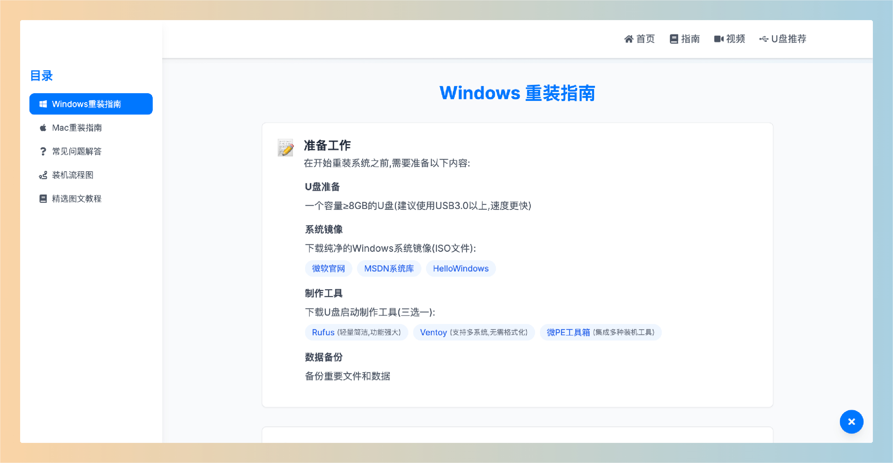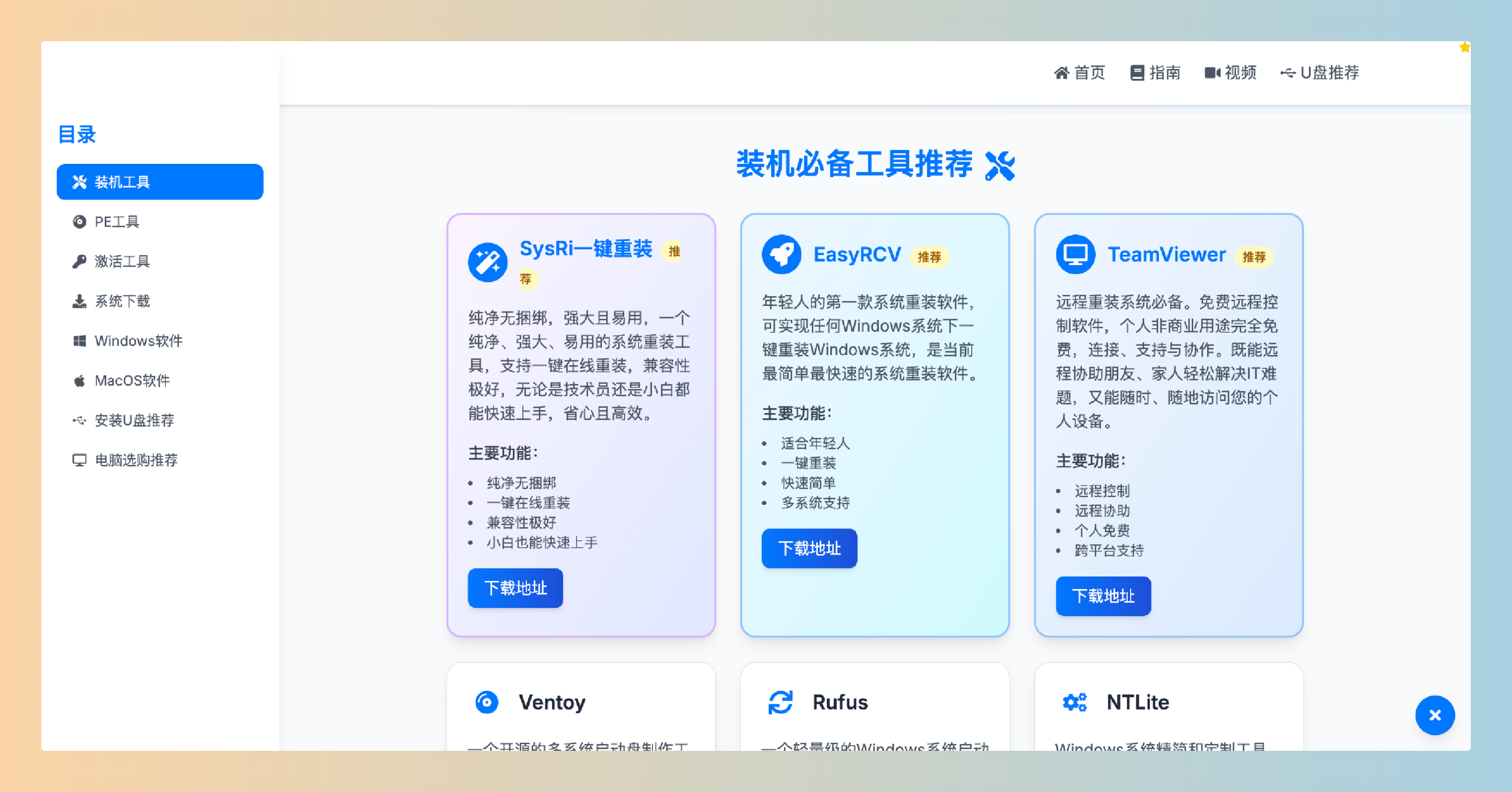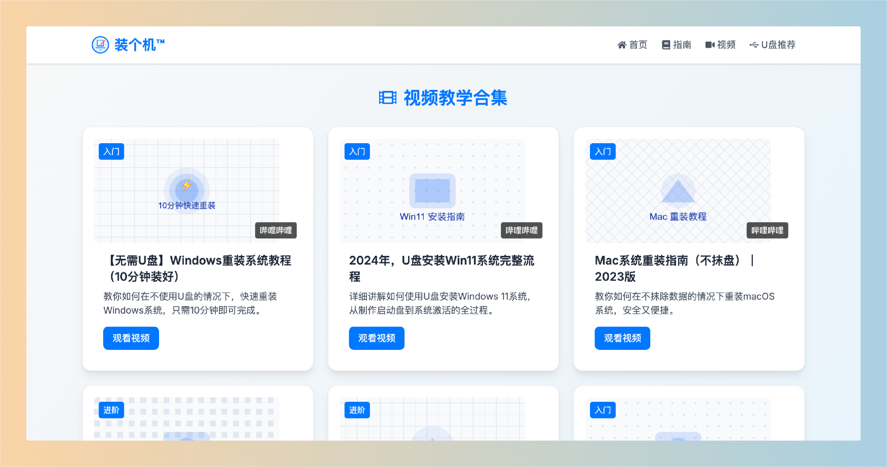 提供Windows/Mac重装系统教程、一键重装系统工具、U盘启动盘制作方法、PE工具、系统激活工具,轻松完成电脑系统安装。